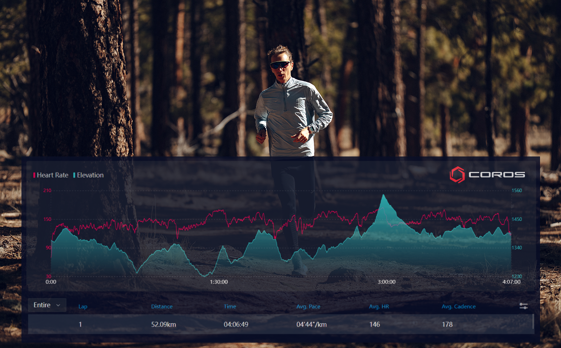 Some long runs include surges or moderate-intensity efforts, while others were focused purely on time-on-feet. He typically dropped to a lower elevation to get more out of the session while still allowing for recovery. In the long run below, he completed 52km at 1200m elevation. To add some extra quality, he included four 10-minute bursts at tempo effort.